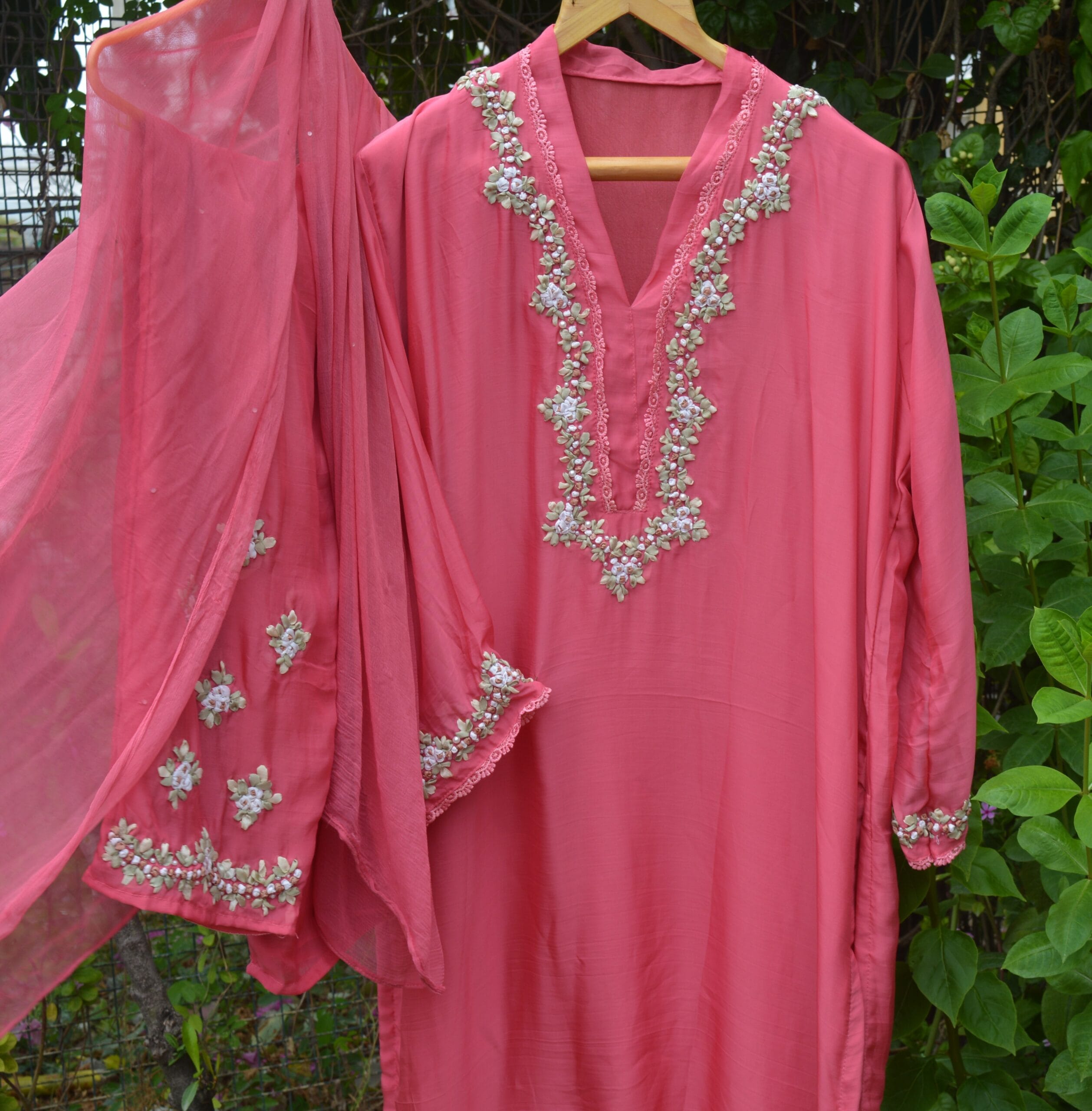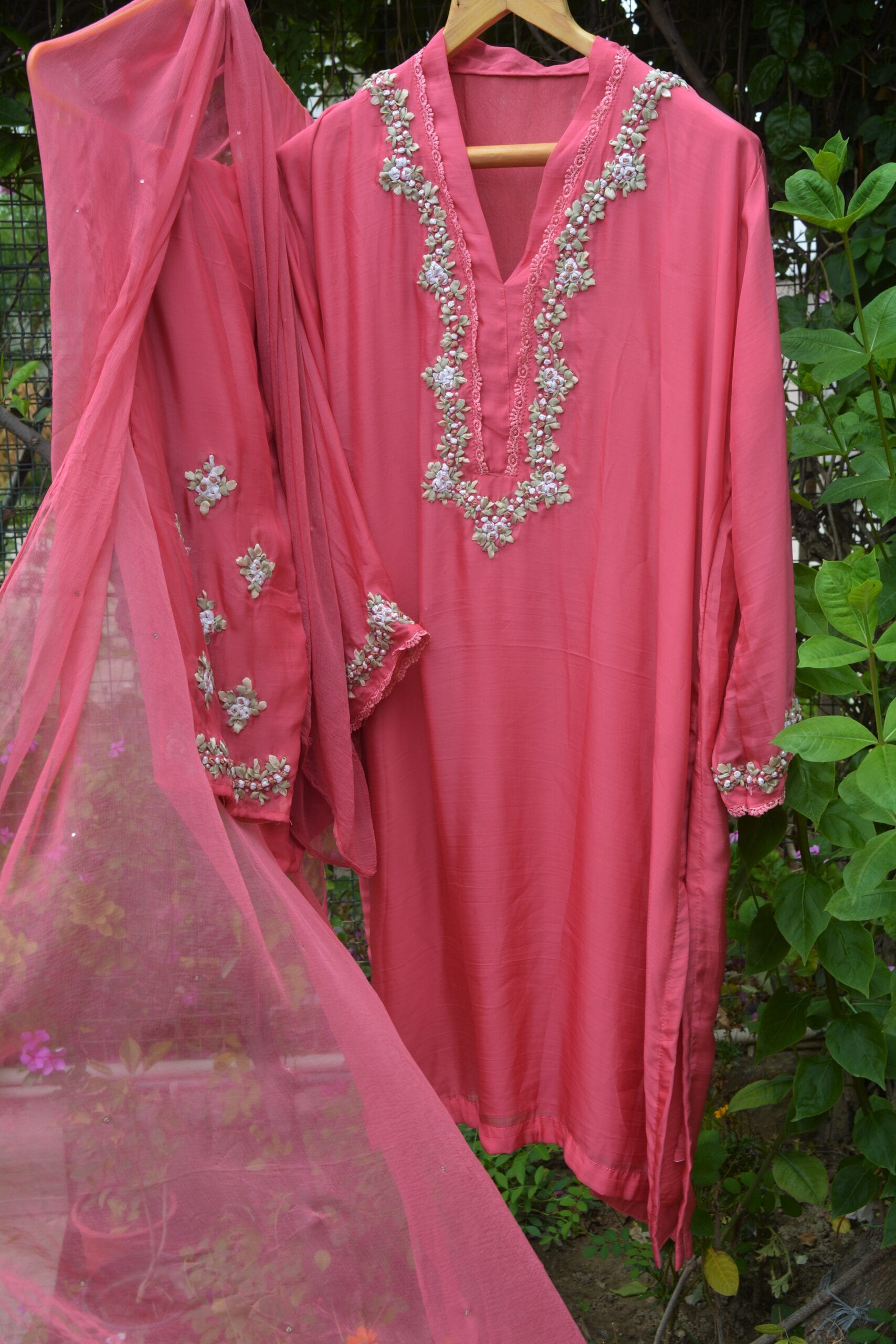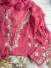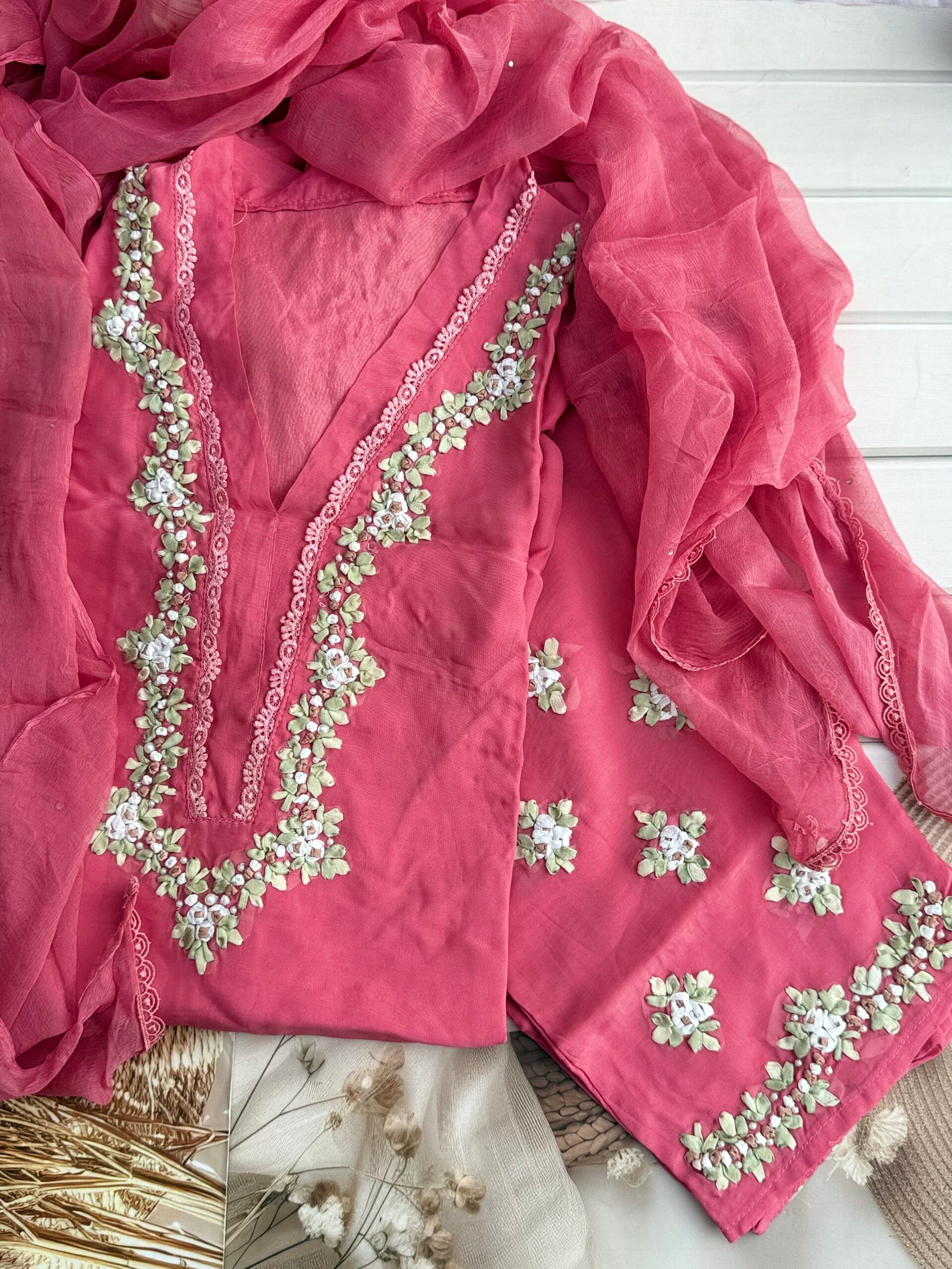Turn heads with this exclusive coral pink organza suit, featuring a stunning fusion of modern ribbon work and traditional floral motifs. Crafted on pure organza, the neckline and hemline are beautifully adorned with intricate ribbon flowers that add dimension, charm, and a touch of luxury to the ensemble.
