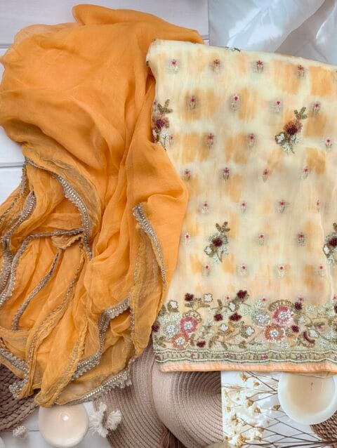 Top: Pure Organza with traditional floral ribbon work on neckline & bottom